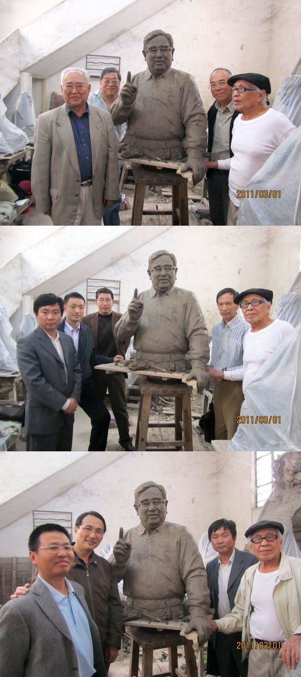 早前泥塑小样做出来后,卢嘉锡先生的亲属们曾对挽衣袖等一些细节提出过修改意见,以更符合卢嘉锡先生的生前形象。曹教授认真听取了亲属意见,对小样作了修改。这次看到的正式泥塑,卢嘉锡先生讲学的形象栩栩如生,充满动感。大家看后都大为赞叹。曹教授首次见到与卢先生长相最为相似的卢嵩岳先生,十分高兴,对着卢嵩岳先生前后左右仔细观看,并拍下照片,然后又当场对泥塑的一些部位进行修整。大师不愧为大师,经过半小时左右的修整,塑像的形态更加传神。卢嘉锡先生的亲属们对塑像的表现形态、大小规格都表示非常满意。随后,大家分别在泥塑前合影留念。中午,广东校友会设宴接待了卢嘉锡先生的亲属和母校来宾,并在宴后为他们送行。广东校友会理事长单明、副理事长兼秘书长王为民,副理事长高碧、田凯,理事梁国荣、温海军等参加了本次活动。