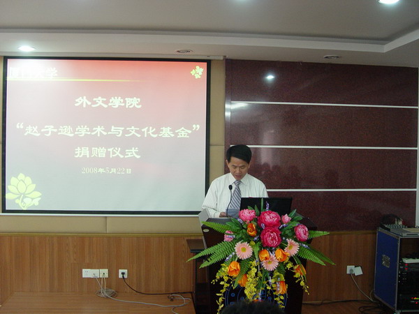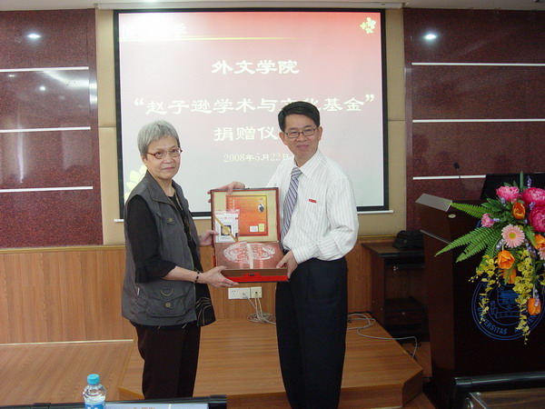 苏子惺书记首先对赵子逊先生的善举给予高度评价,称赞“赵子逊学术与文化基金”对外文学院有着极其重要的意义,并代表全院师生感谢赵先生对母校、母系的一片深情,感谢林淑吟女士为完成先生的遗愿所付出的努力。杨信彰院长介绍了赵子逊先生的生平,着重介绍了他在翻译理论和实践上的著作成就,并盛赞赵先生心系母校、无私奉献的高尚品格。