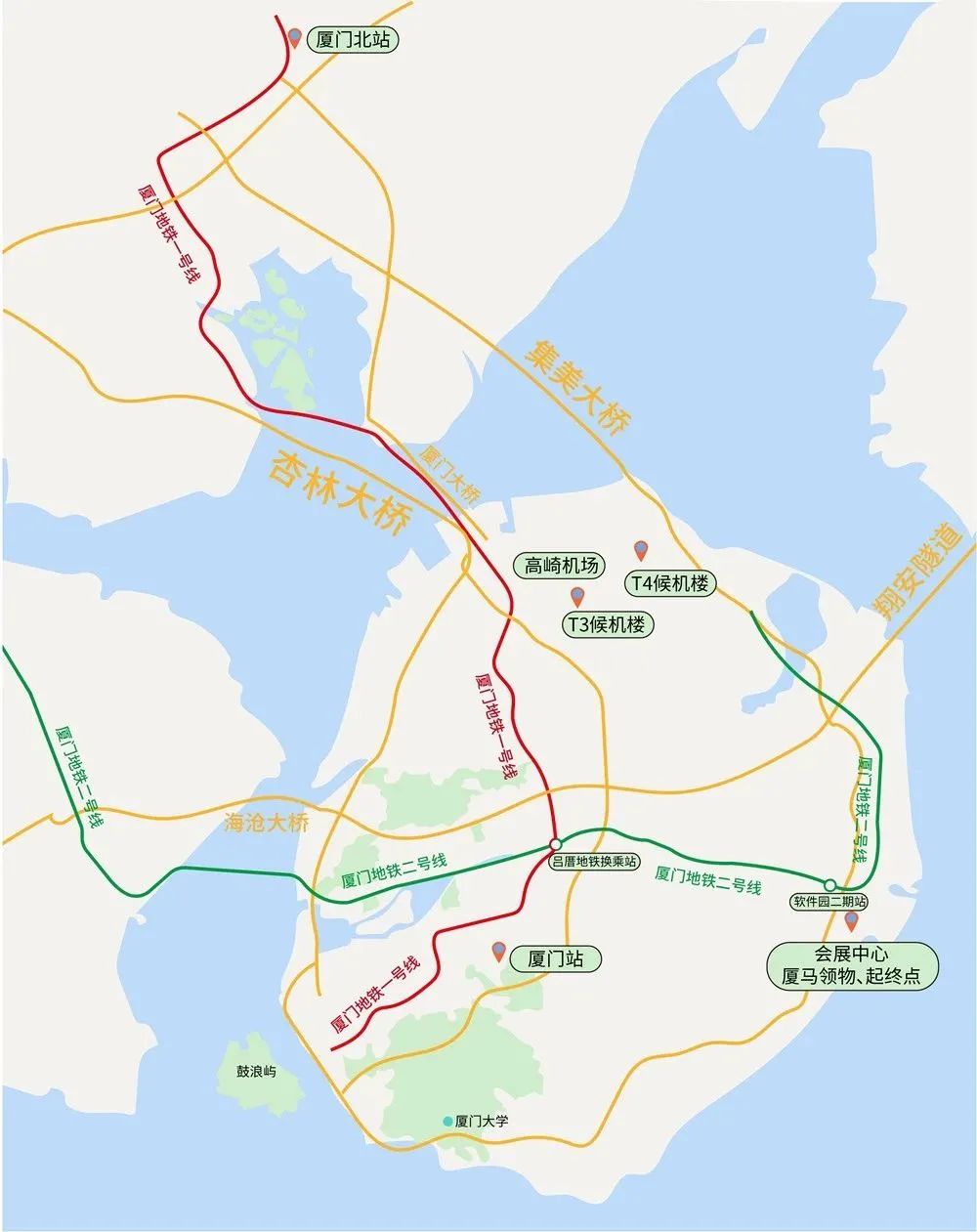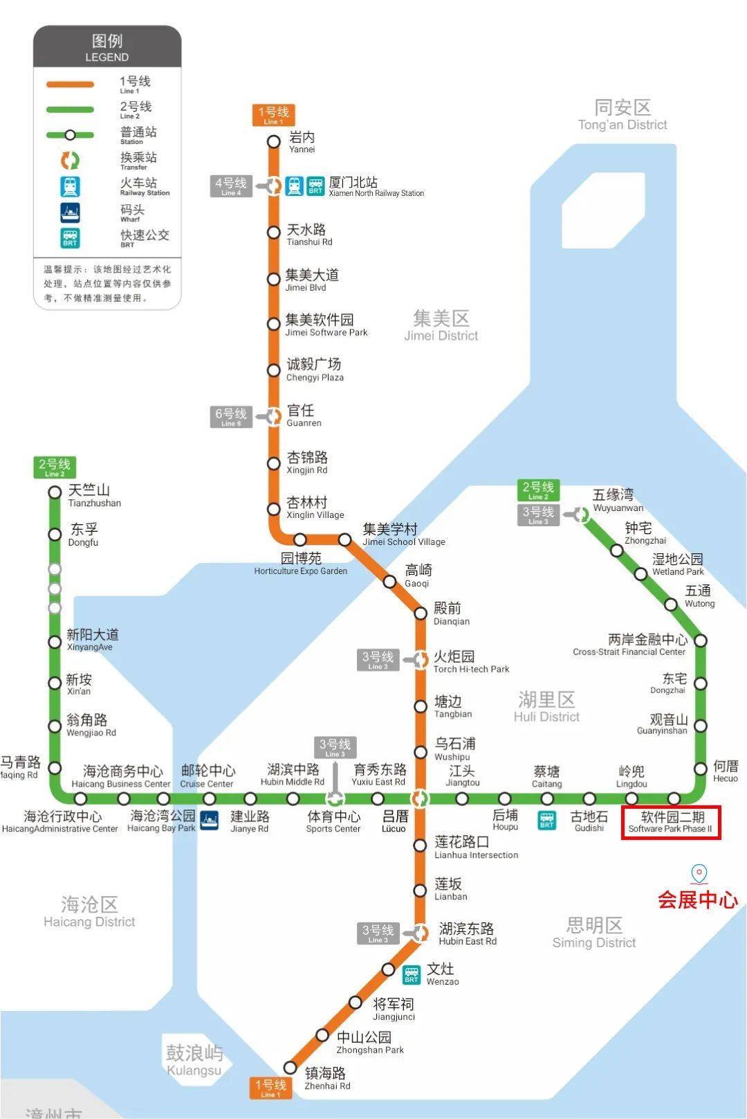 推荐路线:乘坐地铁二号线在“软件园二期站”下车,距离会展中心约1.4公里。乘坐一号线则在“吕厝站”换乘二号线即可。