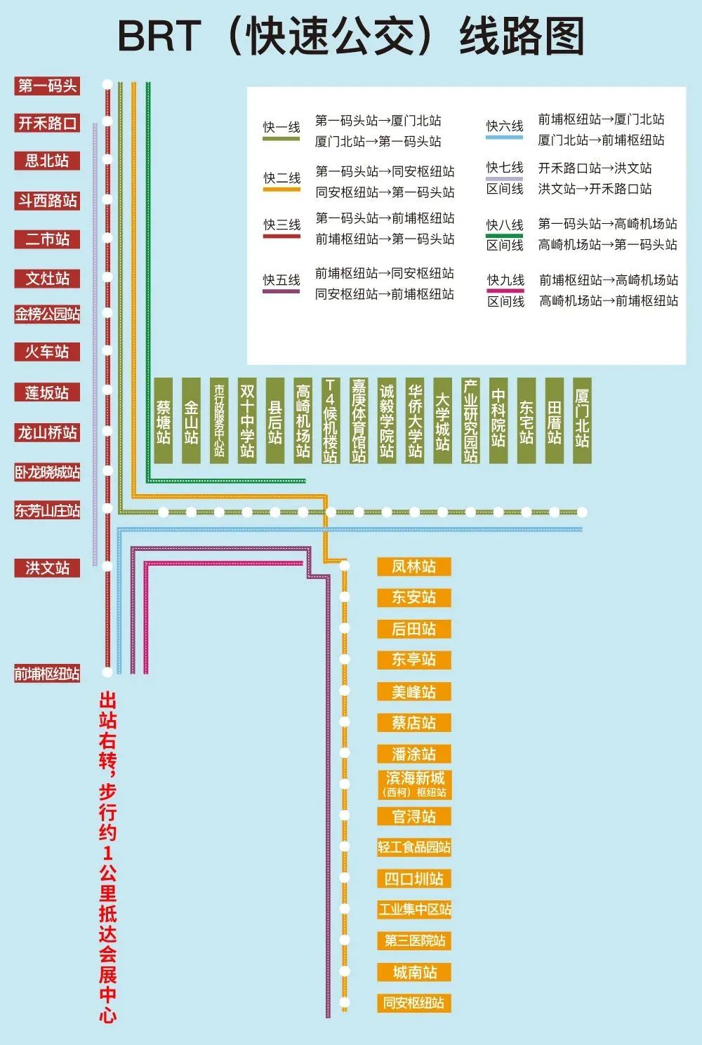 推荐:可从厦门站乘坐快三线、快五线、快六线(从厦门北站)、快九线(从高崎机场站)直达前埔枢纽站,出站后右转,步行1公里左右抵达厦门国际会展中心。