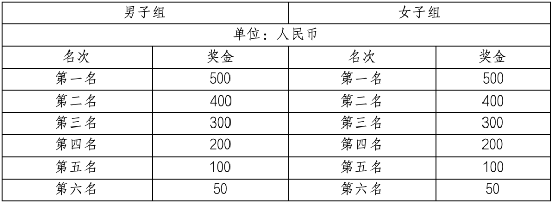 1. 大众组(即所有半程马拉松参赛人员)按照男子、女子分别录取前八名,前八名分别获得奖金,前三名颁发奖杯一座,奖牌一枚。