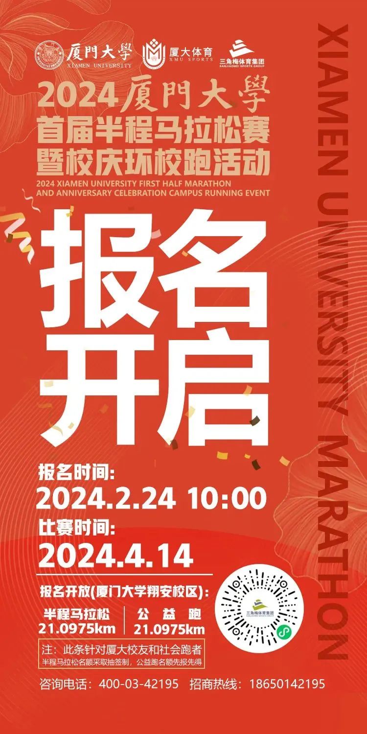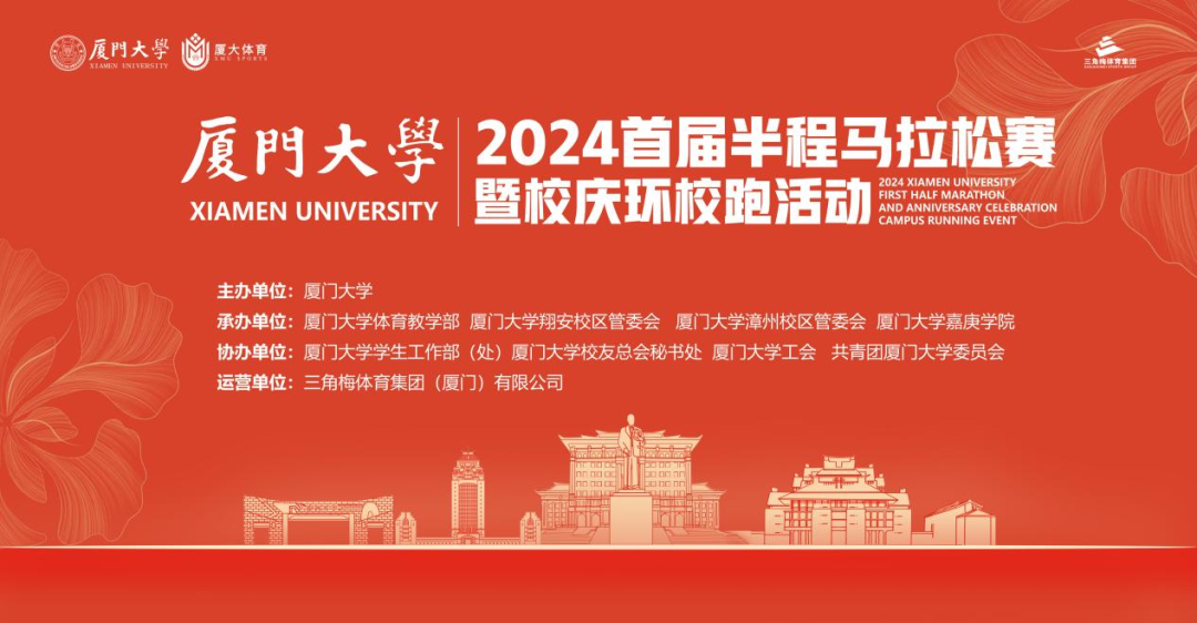 魅力厦门,百年厦大。我们诚挚邀请所有在校厦大师生、全球厦大校友和社会跑者齐聚2024厦门大学首届半程马拉松赛暨校庆环校跑活动现场,在奔跑中品味春日校园的朝气热情,在沿途加油声中体会厦大青春活力与热情的校园另一面,感受厦大丰富的文化内涵及丰厚的百年文化历史底蕴,领略百年厦大的历久弥新,用奔跑书写百年体育传承的赓续华章。