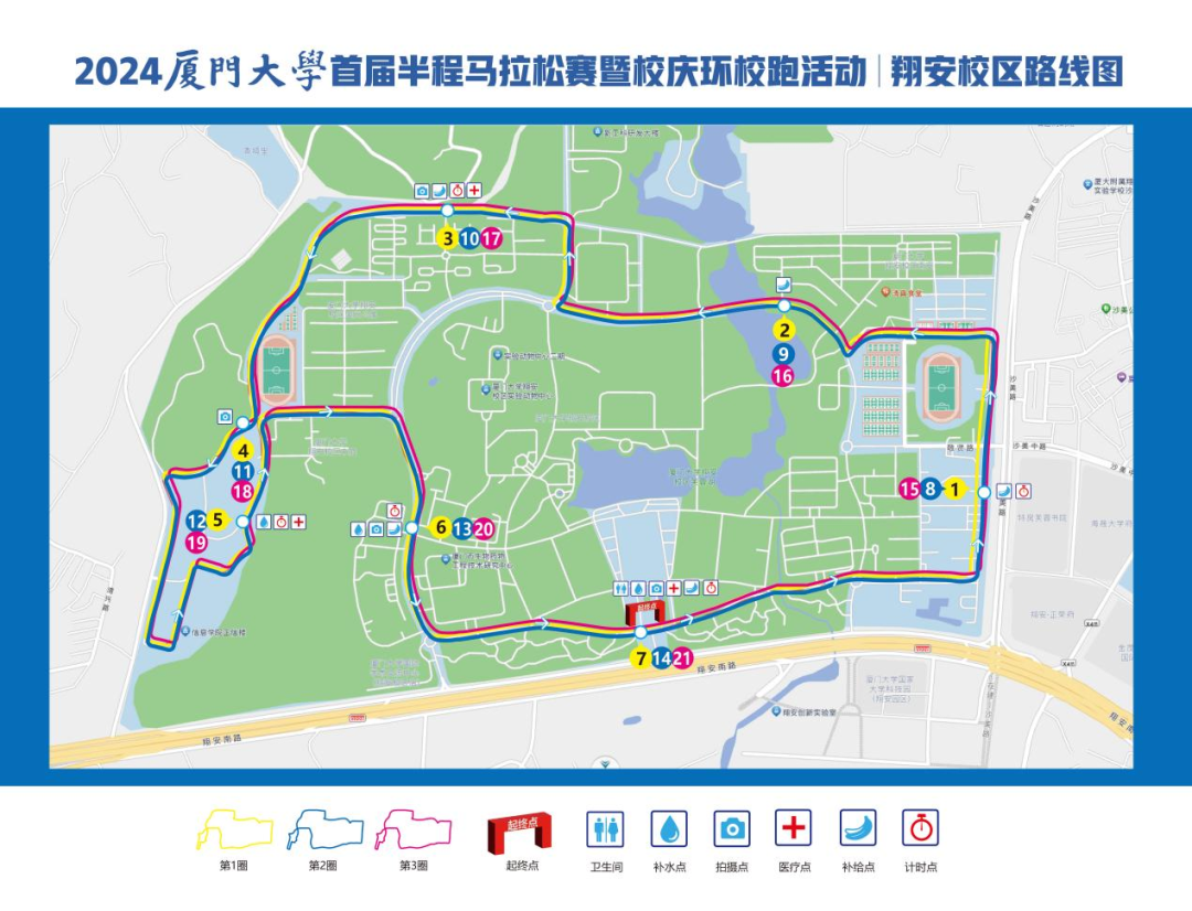 半程马拉松线路(21.0975km):厦门大学德旺图书馆起点→(按比赛线路环校三圈)厦门大学德旺图书馆终点
