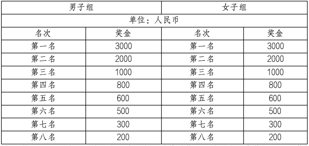 1. 大众组(即所有半程马拉松参赛人员)按照男子、女子分别录取前八名,前八名分别获得奖金,前三名颁发奖杯一座,奖牌一枚。