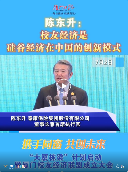 校友经济是大学、校友、城市三位一体、开放包容的经济,可以揽天下英才,产生乘数效应。我相信有了厦门市委市政府的坚强领导和大力支持,有了以厦门大学等高校为代表的厦门校友经济联盟,校友经济一定能在厦门经济发展中产生新的推动作用。我们将发挥保险资金长期性稳定性的优势,继续为厦门经济社会发展、重大项目建设和社会保障体系的发展贡献力量。