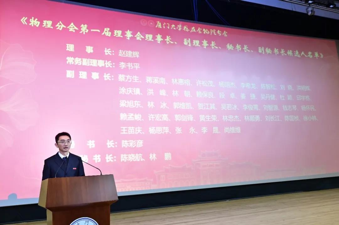 大会审议并通过了《厦门大学校友会物理分会章程(草案)》,以及首届理事会理事长、副理事长、秘书长、副秘书长、理事、顾问等人员名单。会上宣布由赵建辉担任首任理事长,吴伯僖担任名誉理事长,陈彩彦担任秘书长,此外还宣布了包括42位副理事长、42位理事、2位副秘书长、7位秘书和15位顾问的人员名单。