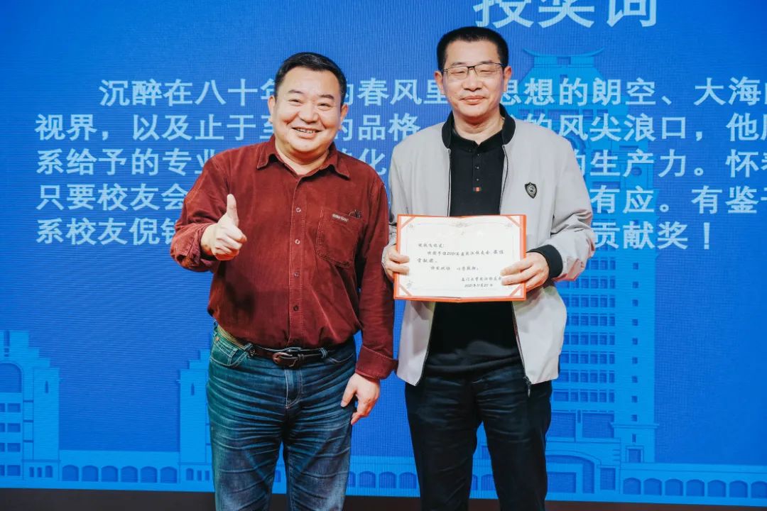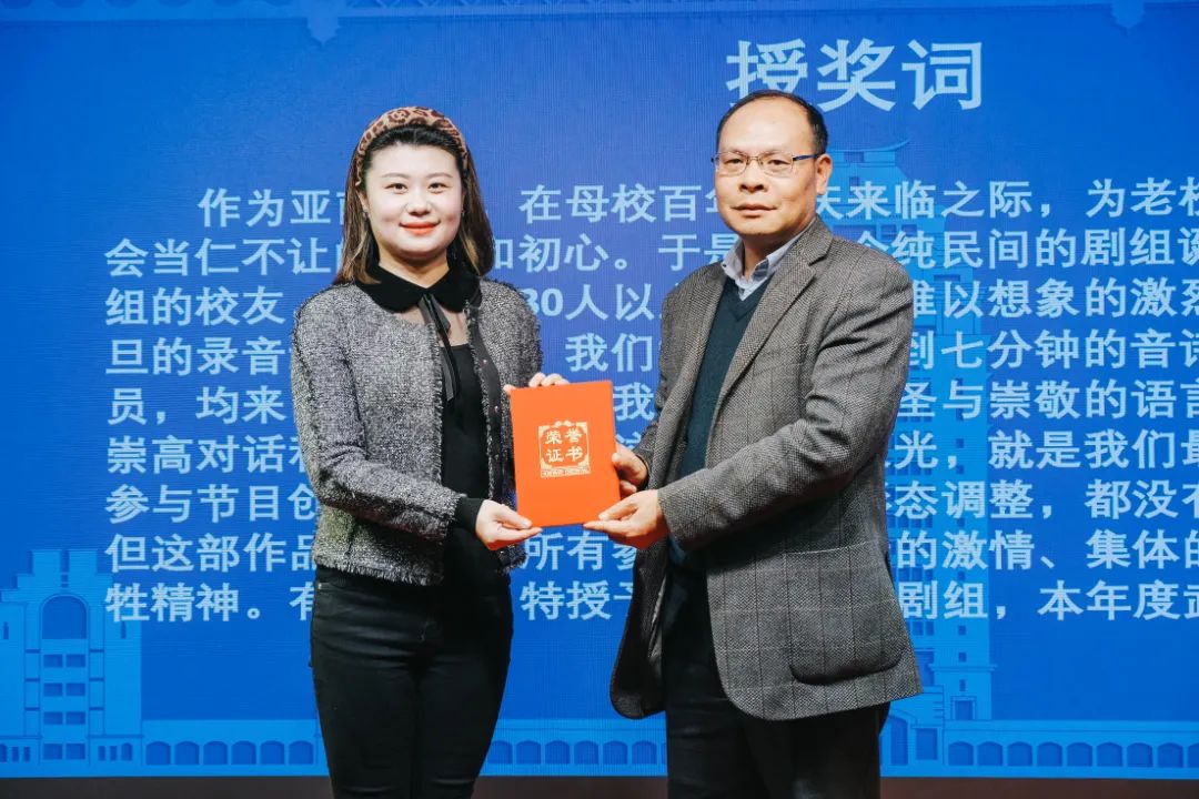 今年也是武汉校友会的换届之年。武汉校友会秘书长林风云受理事长李斌委托,向在场校友作年度工作报告。他结合ppt,用生动的语言向校友们讲述照片和视频背后许多校友动人的故事,追忆了百年校庆梦幻般的日日夜夜。随后,校友会向上一年表现杰出的校友团队及个人颁奖。