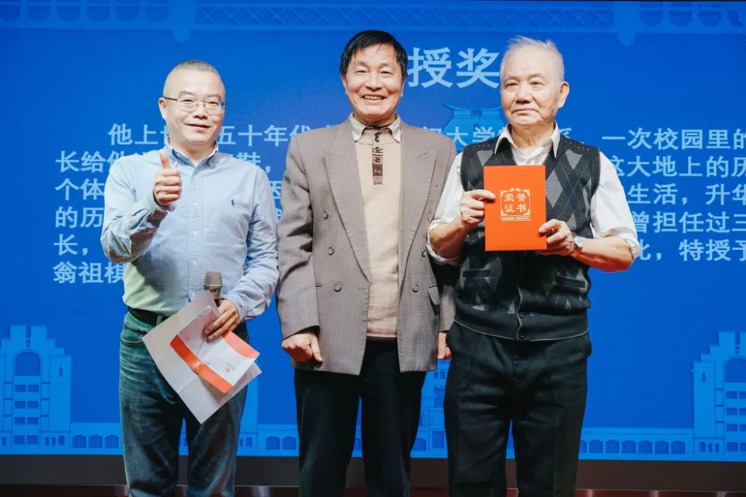 每年年会的第一个环节都是敬老。武汉校友会年龄最大的校友钱学新学长,今年已虚岁100岁。由于年事已高无法来到现场,在座的各位校友通过视频聆听了他讲述记忆中鲜活而难忘的长汀求学岁月。随后,所有到场的老校友登台,接受全场校友的祝福。厦门大学校友总会秘书长张伟、湖北工商联副主席彭斌、武汉校友会副理事长龚翼华为老学长赠送慰问品。