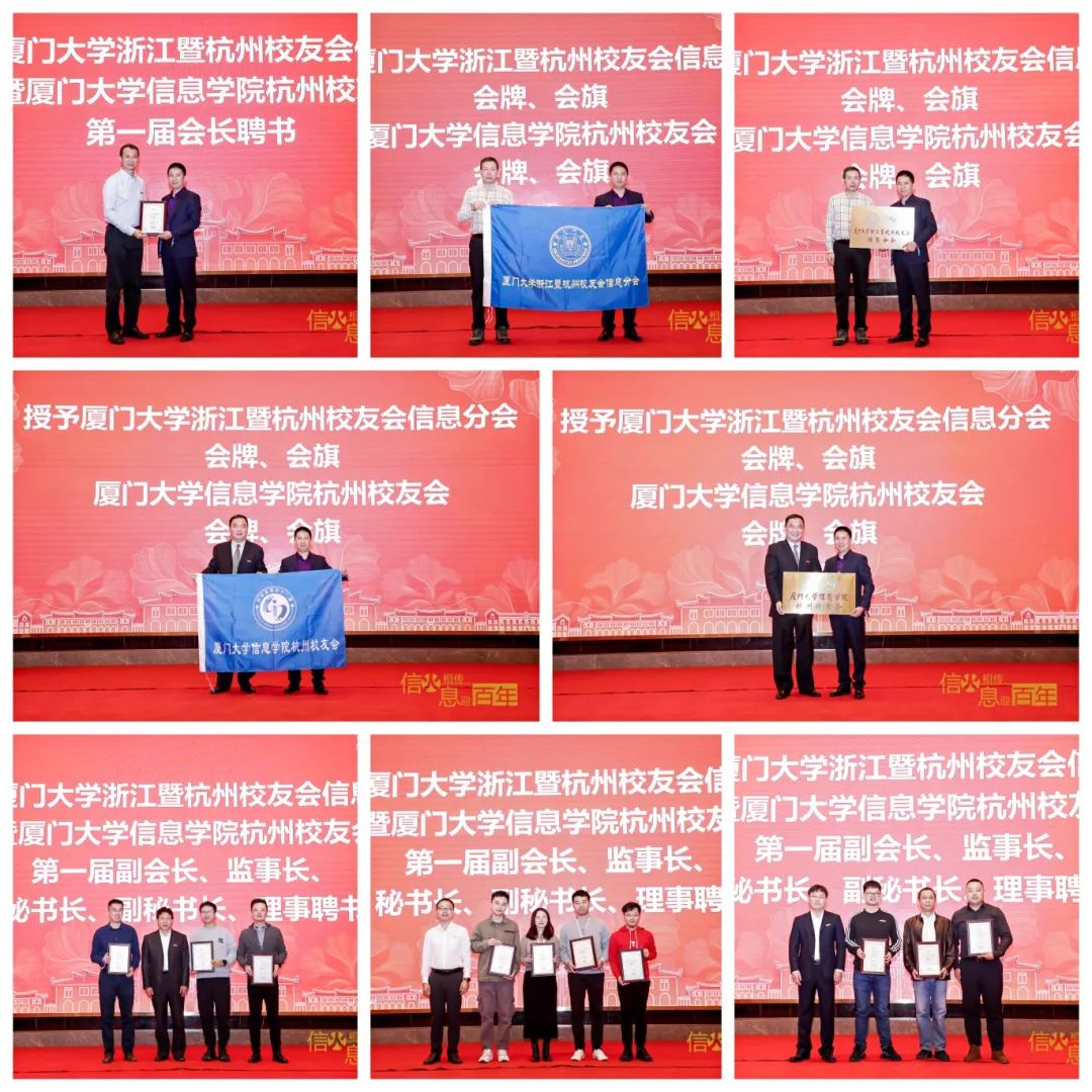 赖虹凯为施伟中颁发会长聘书,徐振晓、刘弢分别向首任会长施伟中授予厦门大学浙江暨杭州校友会信息分会会牌、会旗和厦门大学信息学院杭州校友会会牌、会旗。舒继武、郑辉、郑镇锋分别为信息分会副会长、监事长、秘书长、副秘书长及理事颁发聘书。