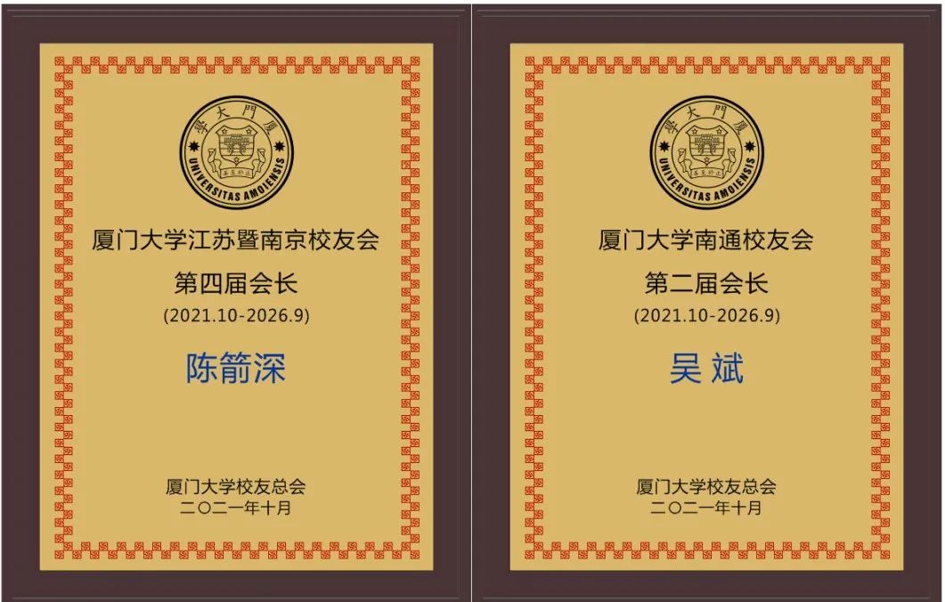 赖虹凯为厦门大学江苏暨南京校友会第四届会长陈箭深续任授牌,为厦门大学南通校友会第二届会长吴斌授牌,校友总会副秘书长郑辉一同见证了授牌仪式。