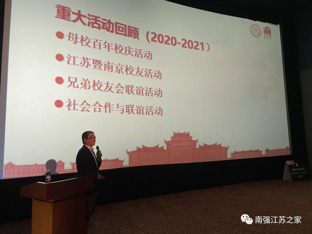 厦门大学江苏暨南京校友会会长陈箭深汇报了校友会2020-2021年度工作,并希望校友们继续支持校友会和母校的各项活动,在各自的岗位上努力奋斗,做出应有的贡献,为母校增光添彩。