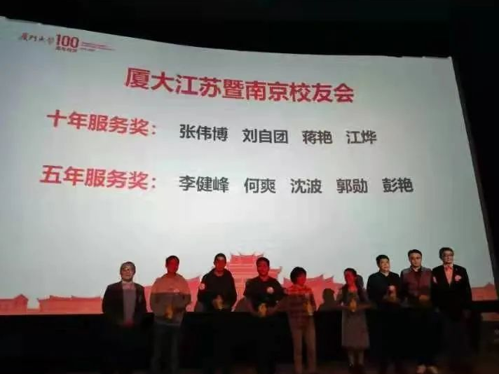 活动还进行了厦门大学江苏暨南京校友会“热心志愿者”表彰仪式,张伟博、刘自团、蒋艳、江烨4位校友获“十年服务奖”;李健峰、何爽、沈波、郭勋、彭艳5位校友获“五年服务奖”。