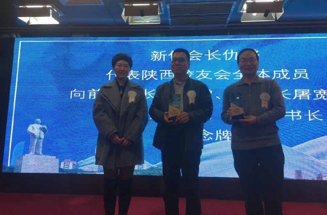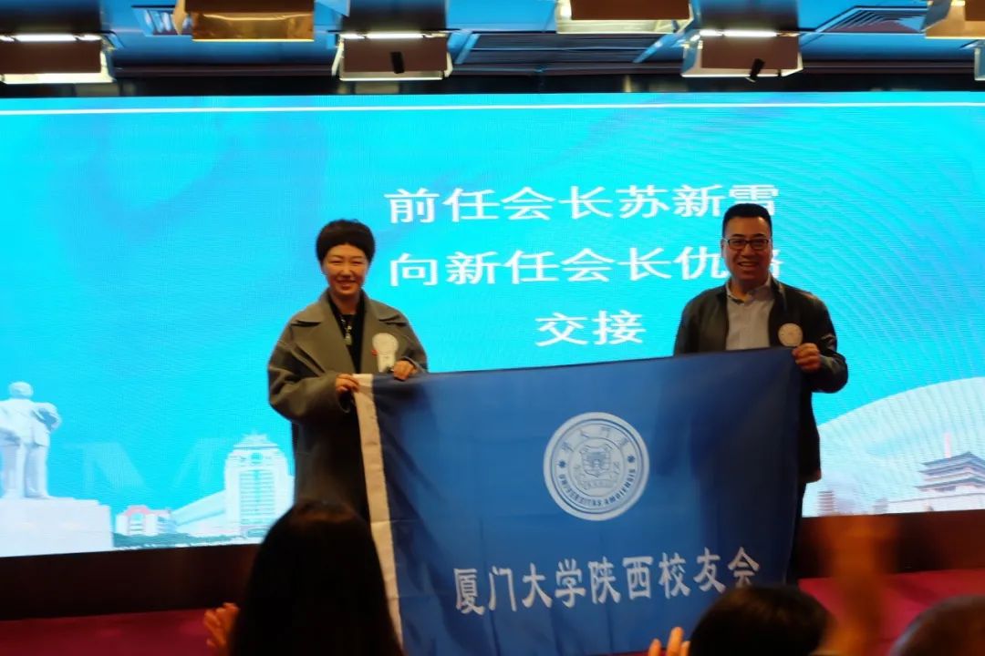 厦门大学校友总会副秘书长杨颖在大会上宣读了陕西校友会第三届理事会名单。前任会长苏新雷向新任会长仇璐交接陕西校友会会旗。新任会长仇璐代表陕西校友会全体成员向前任会长苏新雷、秘书长屠宽祥赠送纪念牌。