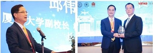 邱伟杰在致辞中,首先对林海川会长带领下的第一、二届理事会工作表示了高度认可,并恭喜林海川会长连任,希望新一届理事会能够继续团结广大东莞校友、服务广大校友,加强与母校的联络和交流,为东莞厦大人提供温馨的精神港湾。他还就母校近期发展和百年校庆筹备工作向东莞校友做了介绍,希望广大东莞校友积极加入到百年校庆筹备中来,群策群力,把百年校庆真正办成师生校友的盛大节日,也在母校百年校庆活动中留下难忘的记忆。邱伟杰代表学校对林海川会长伉俪在服务校友,回馈母校方面的贡献表达了感谢,并现场为林海川会长颁发了“厦大校友服务奖”奖杯,以及“奋进新百年,共筑新伟业”行动计划行动大使荣誉牌。