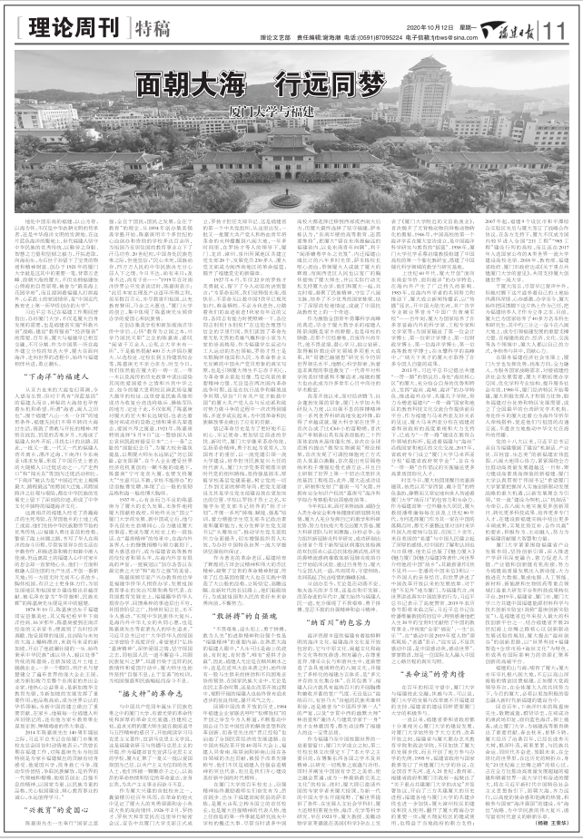 福建的山与海,哺育了厦大;厦大亦牢牢扎根八闽大地,不忘以高山深海般的情谊回馈福建。正如厦大党政领导所言,在全体厦大人的共同努力下,今后的厦大,必将以更加积极的姿态融入到新时代新福建的建设当中。