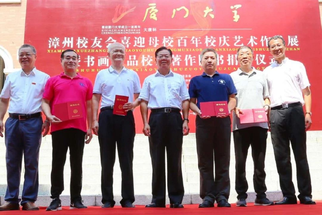 在开幕式上,漳州校友会副会长郭少泽代表6位校友捐赠著作与图书,执行会长兼秘书长吴两同代表30位校友与特邀作者捐赠书画作品与雕塑。朱崇实理事长代表学校接受了漳州校友会的捐赠。朱崇实理事长、赖虹凯副书记、叶世满副校长为捐赠校友与特邀嘉宾颁发捐赠证书并一一致谢,场面感人。