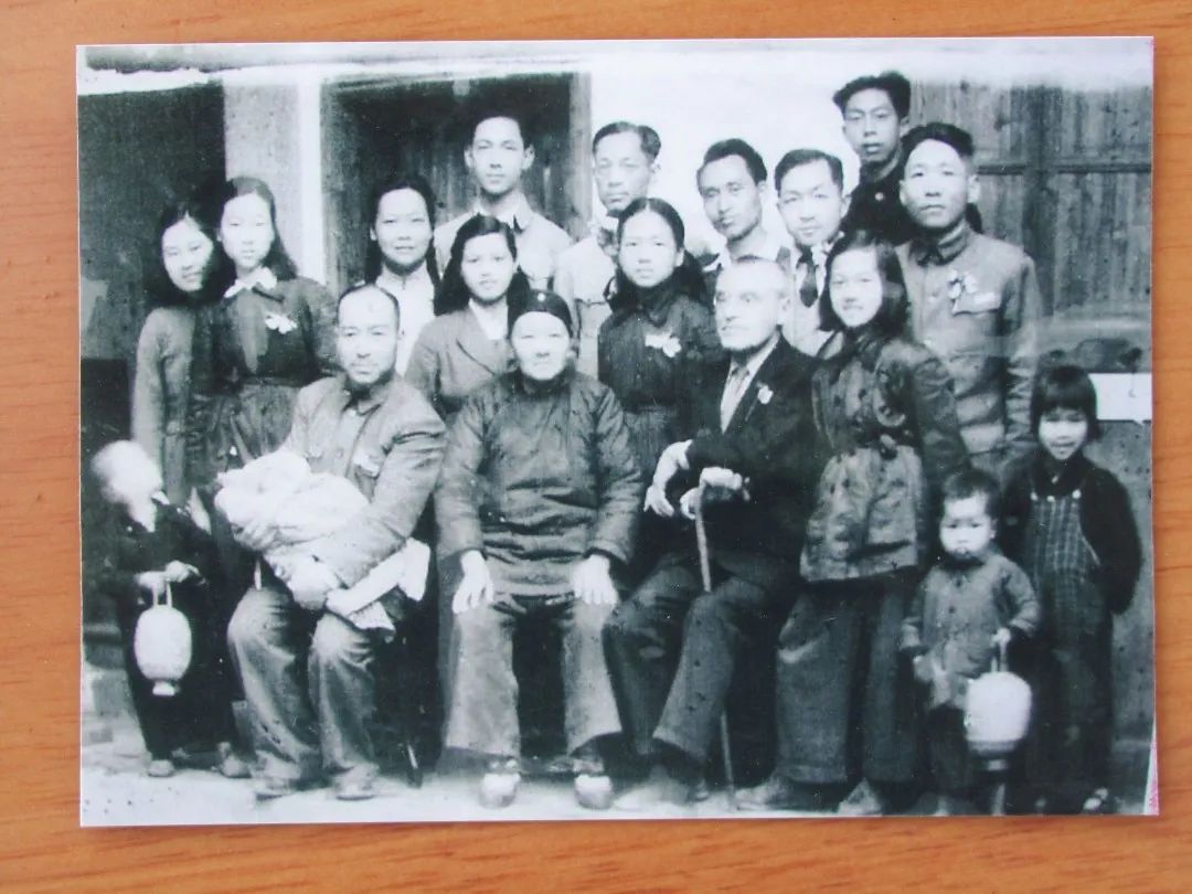 1951年冬,教授们和张朝海全家合影(前排左一汪德耀主任,左三沙彭教授,后排左二赵修谦教授,左三周南生教授,左四郑重主任,左五李博达教授)