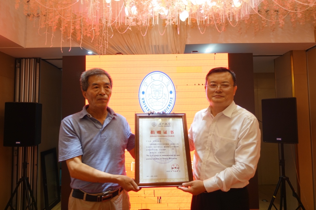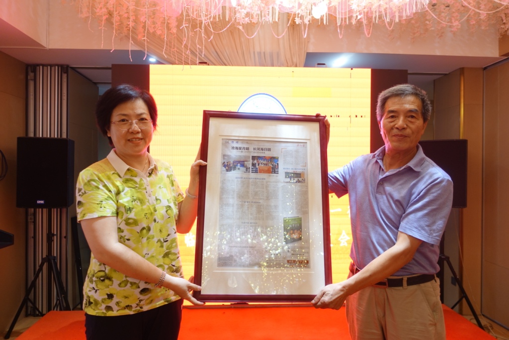 校党委常委、副校长邓朝晖向宁夏校友会赠送裱装好刊载《沧海星月明 长河海日圆——厦大和宁夏的校地情缘》文章的《宁夏日报》;张荣校长向卢大晶颁发“厦门大学‘奋进新百年、共筑新伟业’行动计划”行动大使桃木牌匾及百年校庆捐赠证书。