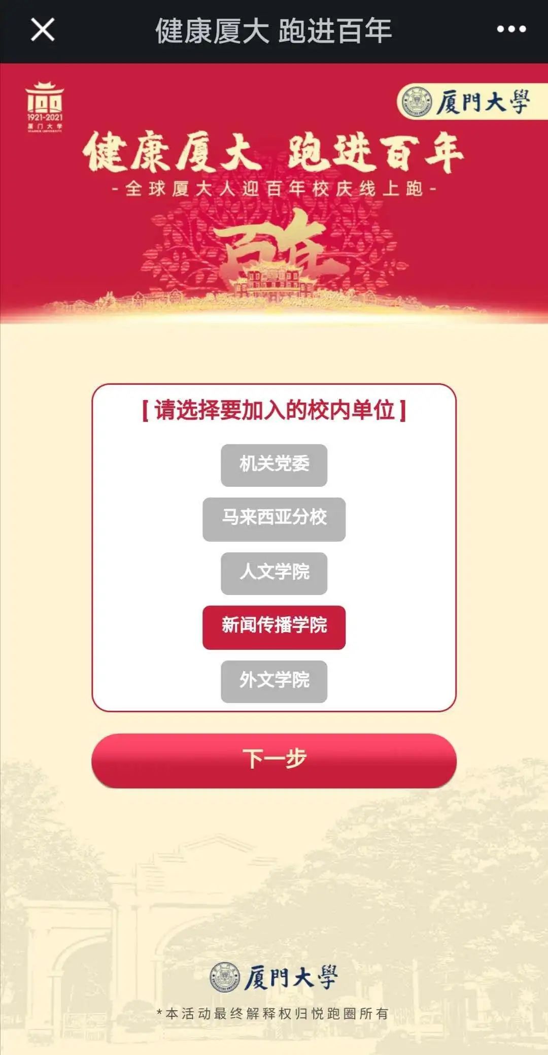 2、参加活动选择加入学院或校友会,选择自己所在单位后点击下一步