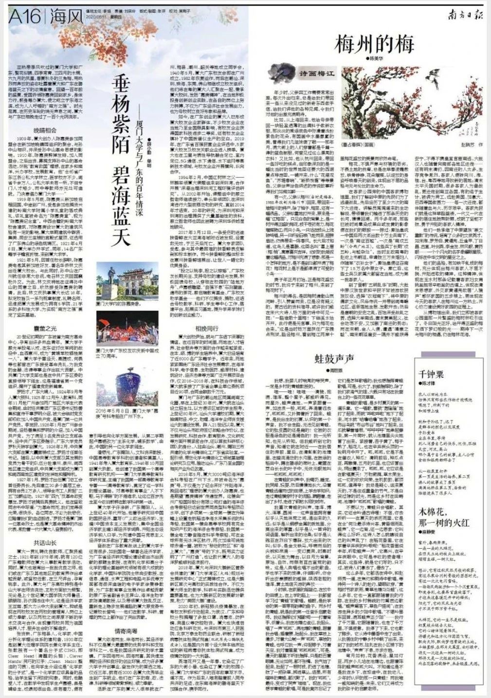 英雄花开又是一年春,它染红了广东的大街小巷,也染红了厦大的校园小径,厦门大学和广东的百年故事写不尽,道不完,作为后来人唯有踏着前人同舟共济的足迹,在东南海岸的碧海蓝天下加强合作,携手同行。
