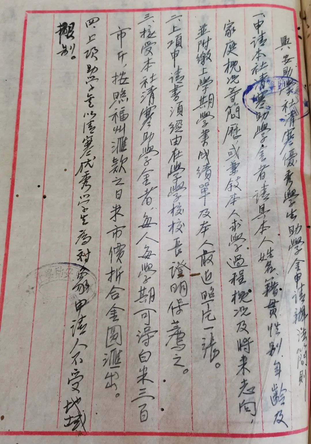 除外,表现突出的还有“莆仙兴安助学社”。该社在向当时的厦大校长汪德耀致函曰:“际兹国家支离,民生凋敝之时,本社于爰创设,……素仰贵校历史悠久,办学认真,人才辈出,爰敢函请贵校长就贵校……诸学生中推选清寒优秀者,保荐函知敝社,当即汇上助款,聊助其不足之需。”并附有该社拟定的选荐简则。