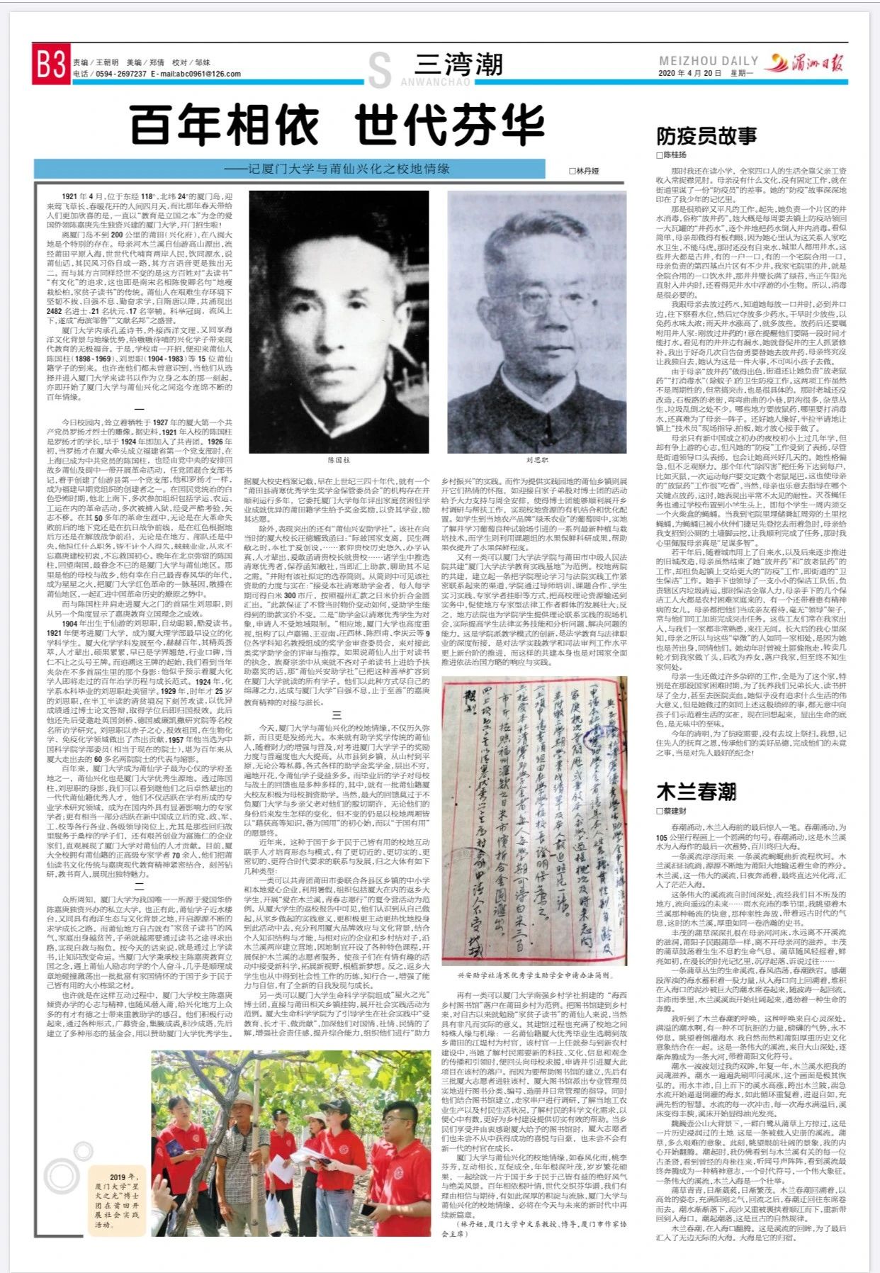 厦门大学与莆仙兴化的校地情缘,如春风化雨,桃李芬芳,互动相长,互促成全,年年根深叶茂,岁岁繁花硕果,一起绘就一片于国于乡于民于己皆有益的绝好风气与绝美风景。百年相依根叶情,世代交织芬华谱,我们有理由相信与期待,有如此深厚的积淀与流脉,厦门大学与莆仙兴化的校地情缘,必将在今天与未来的新时代中再续新篇章。
