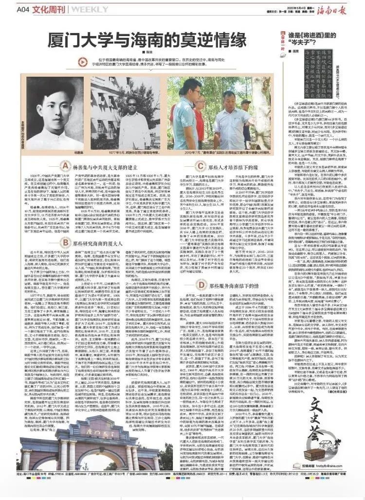 韩振华所在的厦门大学南洋研究所,是我国最早设立的东南亚研究机构。2012 年,厦门大学又成立了南海研究院,以南海、中国东南海疆为焦点,广泛研究海洋法、海洋政策、海洋历史等领域有关问题。因为南海、南洋,厦门大学与海南、与海南高校往来合作频繁。