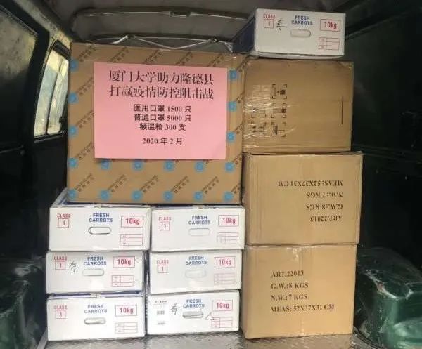 从校级留存党费中安排向隆德县捐助脱贫攻坚专项资金150万元,其中50万元用于支持当地疫情防控工作。针对防疫物资紧缺问题,按照“隆德所需、厦大所能”原则,积极拓宽渠道,先后筹集捐赠红外线测温仪300个、普通一次性口罩7000只、医用口罩1500只,并协调校友企业向隆德县捐赠医用口罩14.5万只和价值8万余元食品,为隆德县做好疫情防控提供物资援助。