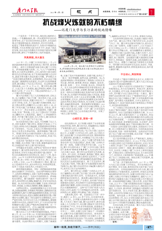 历史在发展,时代在前进。厦大与长汀在抗战烽火中炼就的不朽情缘,犹如鹭江滔滔浪和汀江潺潺水,永续不断,必将在实现中华民族伟大复兴的新时代中放射出更绚烂的光辉。