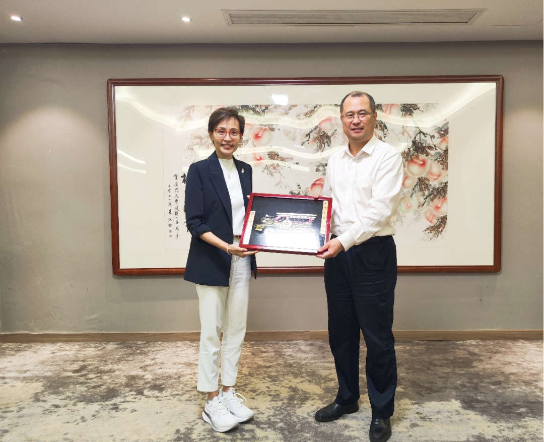 佘怡静代表菲华体育总会向厦门大学回赠纪念品,林东伟代表学校接受馈赠。