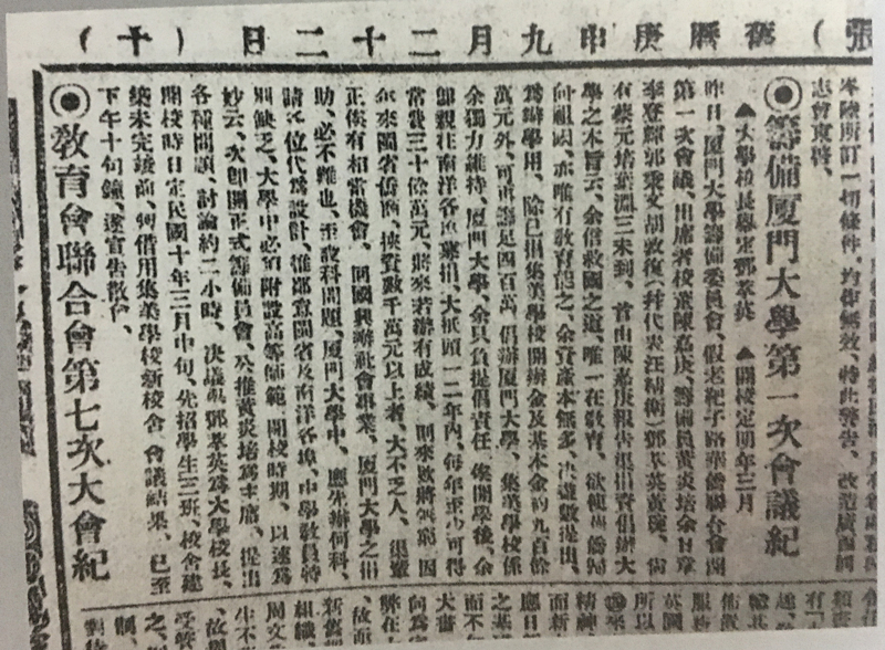 上海《申报》一九二〇年农历八月二十五日的厦大筹备报道