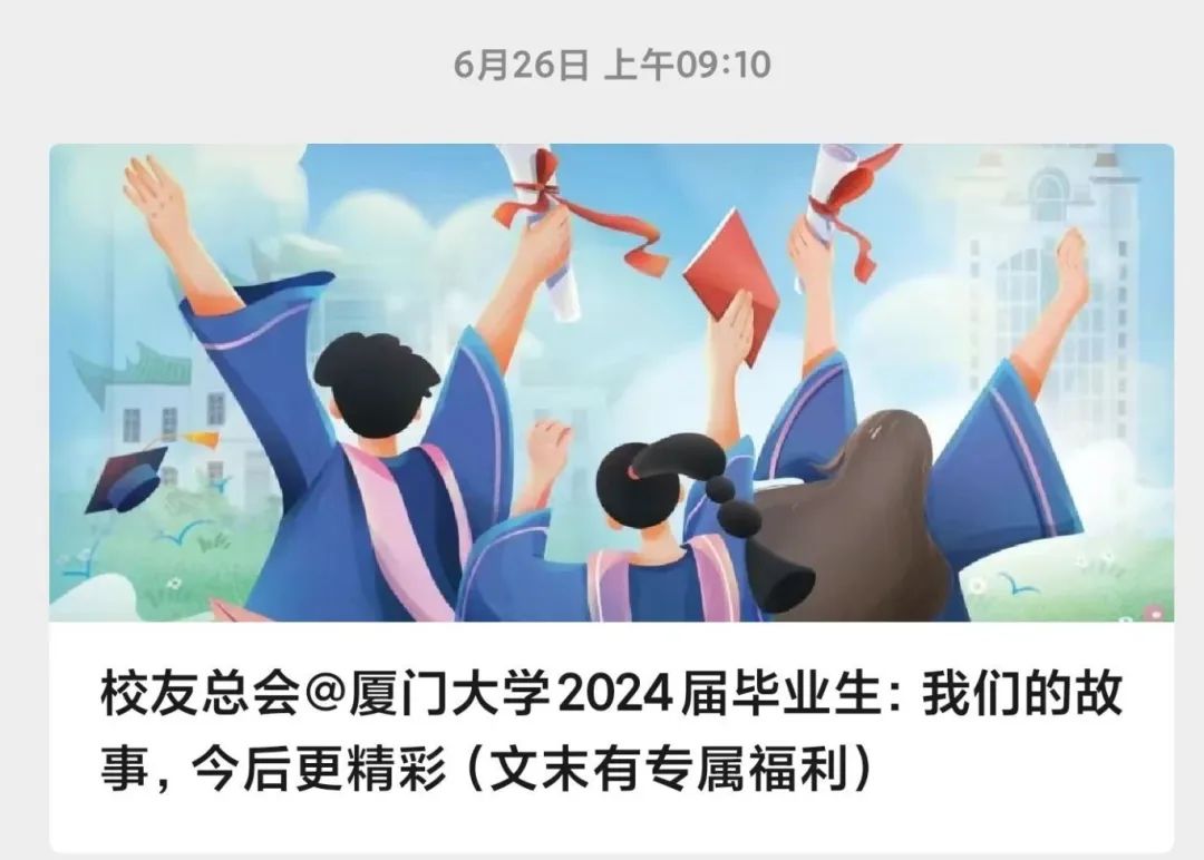 此外,秘书处还通过微信公众号发布《致厦门大学2024届毕业生》推文,为2024届毕业生提供专享“大礼包”,助力大家尽快实现从“学生”到“校友”身份转变,并为部分积极参与留言互动的“新校友”提供别致纪念品。