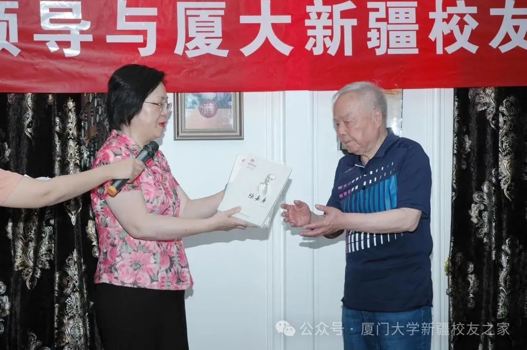 今年是校主陈嘉庚先生诞辰150周年,邓朝晖特别向与会新疆校友代表赠送《陈嘉庚传》,勉励广大校友传承“嘉庚精神”,争做“嘉庚传人”。谭一文代表新疆校友接受赠书。