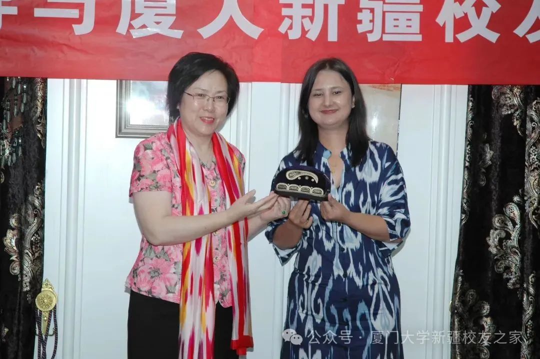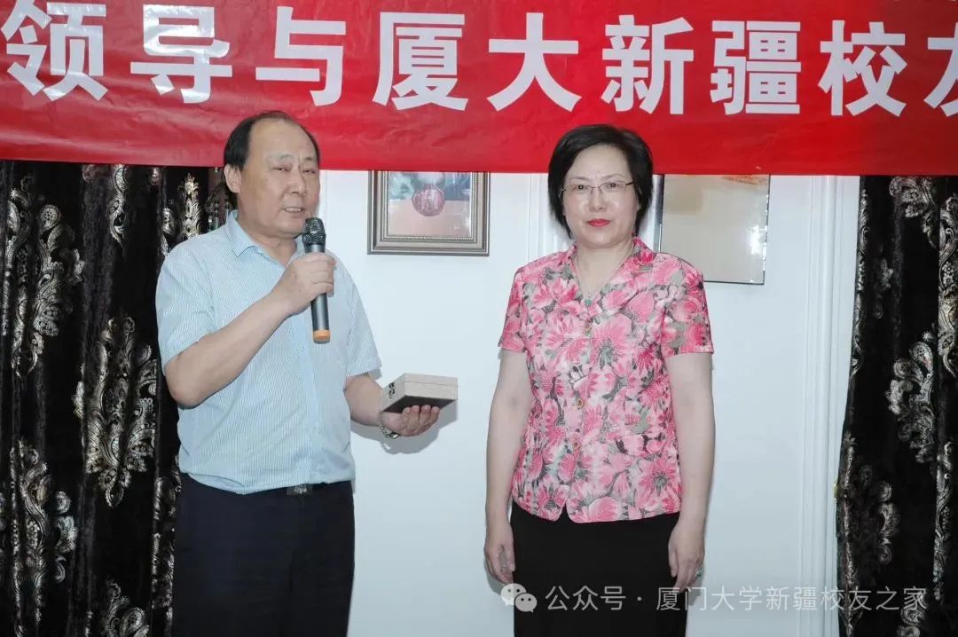 随后,1985级会计系校友、中国人民银行昌吉回族自治州分行常务副行长余飞代表校友会向邓朝晖赠送刻有“白鹭恋红柳,瀚海望天山”印章,寓意新疆校友与母校的亲密联系 。