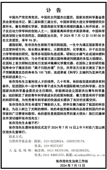 张存浩学长祖籍山东无棣,1928年生天津,年少时随姑父傅鹰、姑母张锦于重庆、福建等地辗转求学。1943年考入厦门大学化学系,次年转入重庆中央大学化工系,1947年至1948年在天津南开大学化工系读研究生。1948年赴美留学,1950年获美国密西根大学硕士学位,1998年获香港中文大学荣誉理学博士学位。1950年回国后,历任中国科学院大连化学物理研究所所长、国家自然科学基金委员会主任、中国科学院学部主席团成员及化学部主任、中国科协副主席等职。1980年当选中国科学院学部委员(院士),1992年当选第三世界科学院院士。曾获1999年度陈嘉庚化学科学奖,2002年度何梁何利基金科学与技术进步奖,2013年度国家最高科学技术奖,并多次获得国家自然科学奖和国家科学技术进步奖。第19282号小行星永久命名为“张存浩星”。