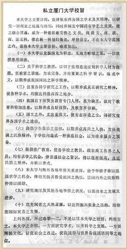到厦大视事当天晚上,林文庆召集了一个学生座谈会,宣布要把厦大“办成一生的非死的,真的非伪的,实的非虚的大学”。之后,他从自己心中的“止于至善”的境界出发,以其通西学尊中学的思想和多才严谨的品格为厦大带来了最初的一套独特的办学主张和实现陈嘉庚办学理想的周密思考,确立了私立时期厦门大学的办学宗旨、组织机构、学院规则、学生通则等一整套系统的纲领、章程与制度。