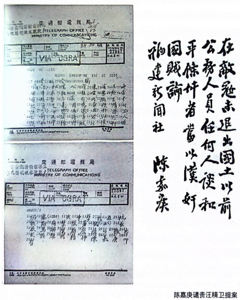就在《日汪协定》签订的第二天,陈嘉庚再次致电蒋介石,谴责汪精卫“不仅为总理之叛徒,亦为中华民国之国贼”,要求蒋介石“宣布其罪,通缉归案,以正国法,而定人心”。(8) 对于这一段过程,陈嘉庚在《南侨回忆录》中有这样一段叙述:“迨汪逃至安南,余即电中央政府宣布汪卖国罪状,请革职通缉。否则,必逃往南京任敌傀儡。然政府尚徇党情不纳。其后经八九个月汪由香港而日本,始下令革职通缉,已太迟矣。”(9)