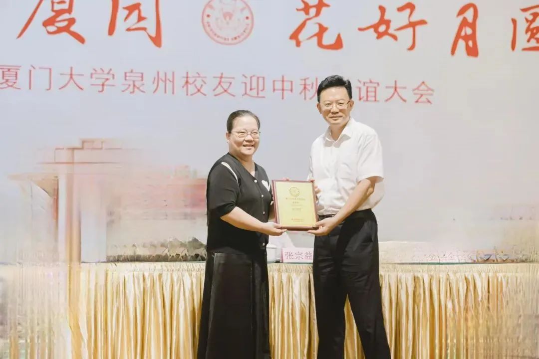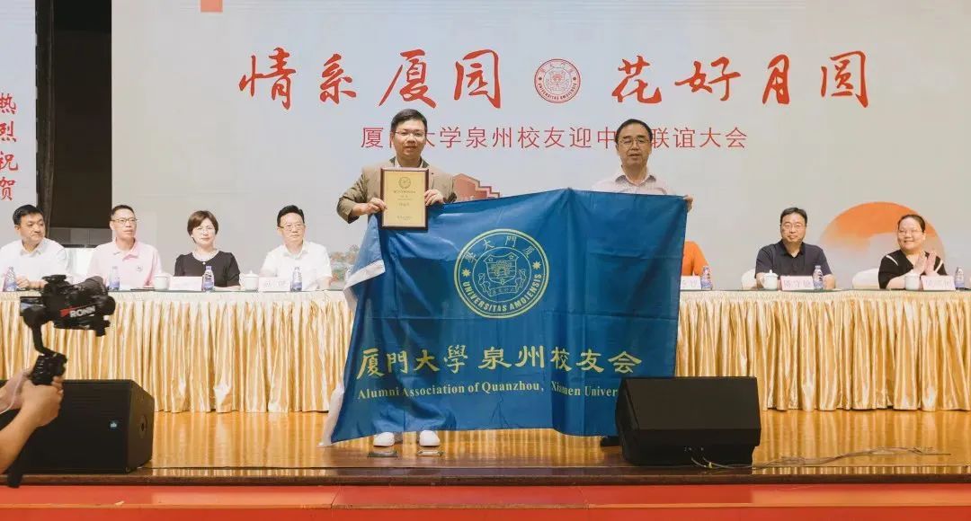 张宗益向新一届厦门大学泉州校友会颁授会旗,为许金升颁发会长牌