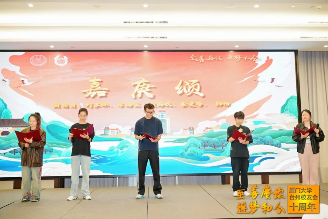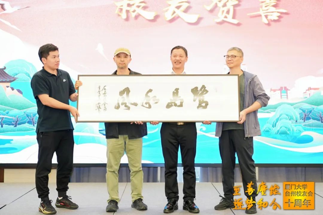 徐振晓、傅琳分别代表兄弟校友会致辞,他们回顾与台州校友会十年来的缘分和故事,并为台州校友送上诚挚的祝福。台州学院教授陈继军校友赠送“鹭岛和风”书法作品为校友会成立十周年献礼。台州校友会发起人之一毛恩荣校友也特意从北京发来祝福视频。