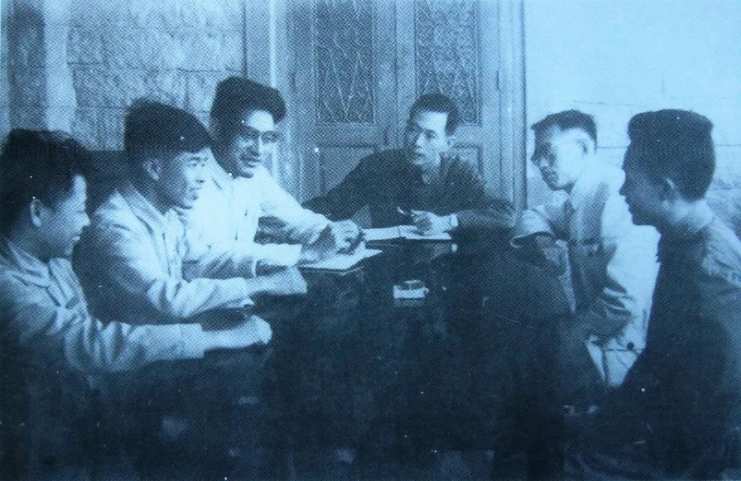 1953年,张玉麟(右三)、未力工(右二)与中共厦门大学委员会委员研究防空工作