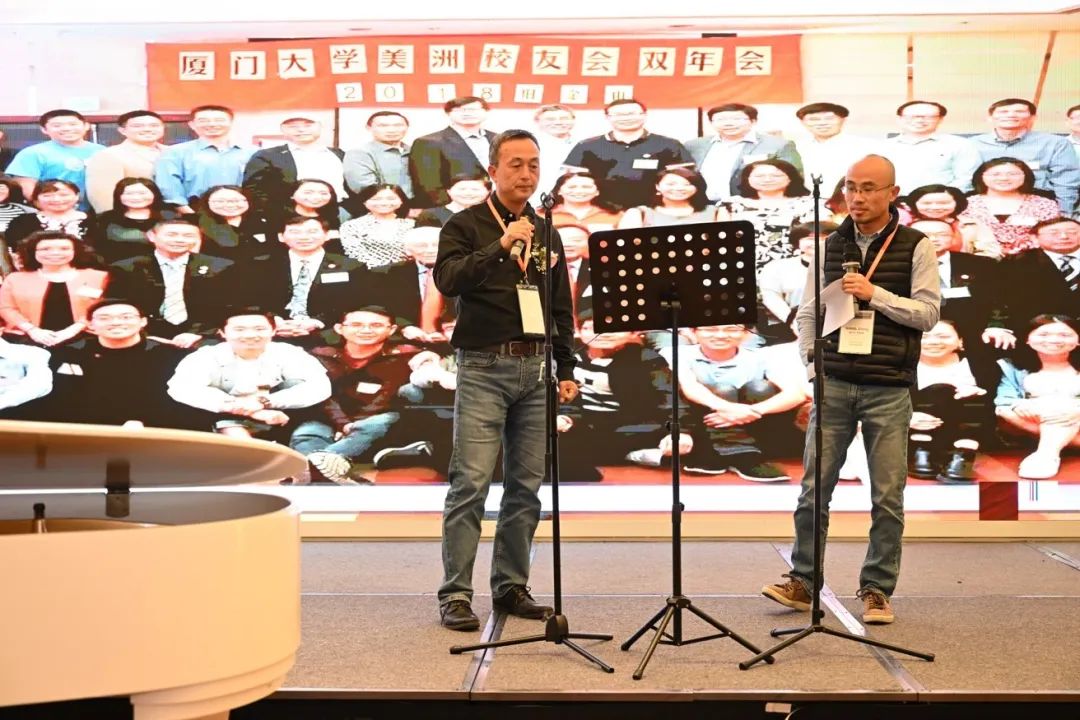 双年会承办方厦门大学南加州校友会理事长、1994届美术系校友张鼎健致欢迎词。2020-2022届理事长、1988届物理系校友吴丹健、孙淑婷分别汇报各自任期内理事会工作。吴丹健还代表2018-2020届理事长、1982届化学系校友陈强作任期内工作汇报。