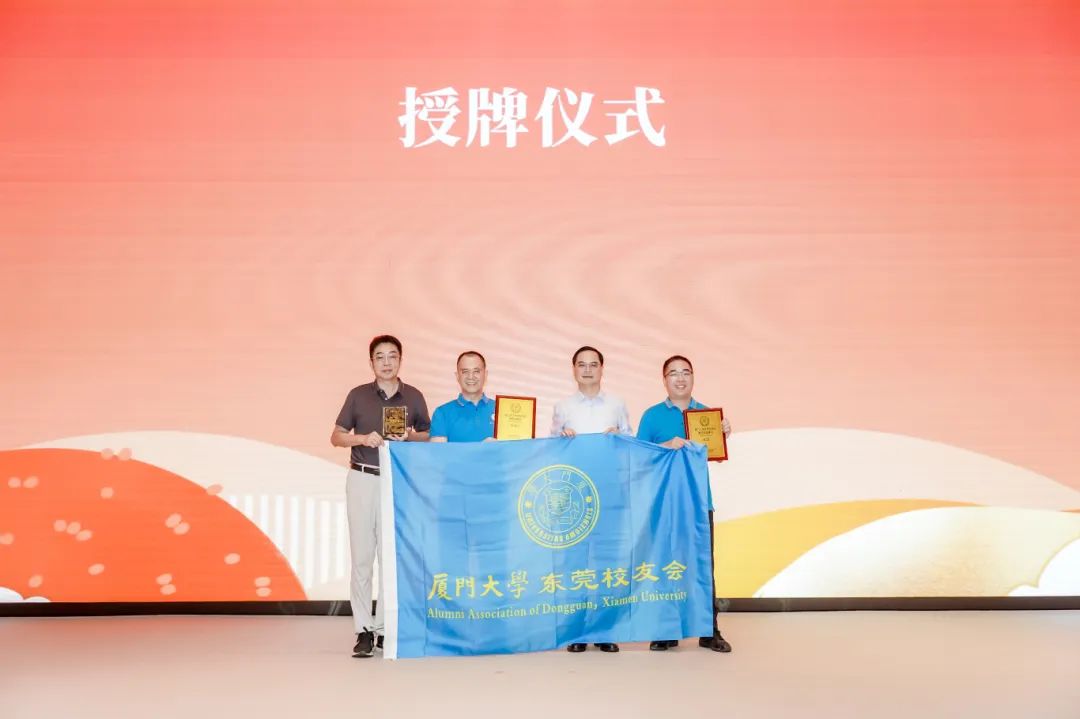 邱伟杰为林海川、陈龙授牌,并为东莞校友会授旗。