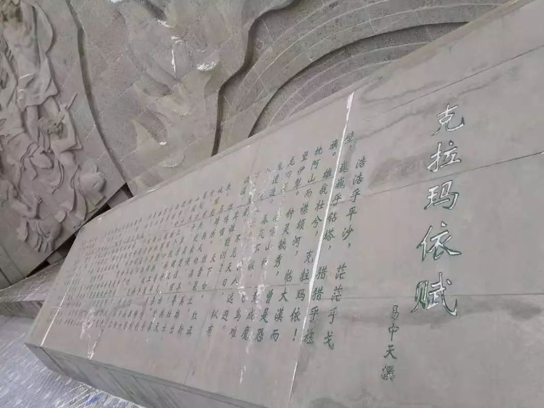 曾在新疆生产建设兵团农八师共青团农场(现第八师150团)度过了一段青春时光的厦门大学教授易中天,由他创作的四六骈体《克拉玛依赋》被镌刻在一面英雄浮雕墙上,成为今天美丽的克拉玛依市步行文化街中心的一道新景观。“浩浩乎平沙,茫茫乎戈壁,巍巍乎钻塔,猎猎乎旌旗。雄哉壮兮,克拉玛依!……”易中天极尽文学之能反映了这座油城的前世今生和创业历程。