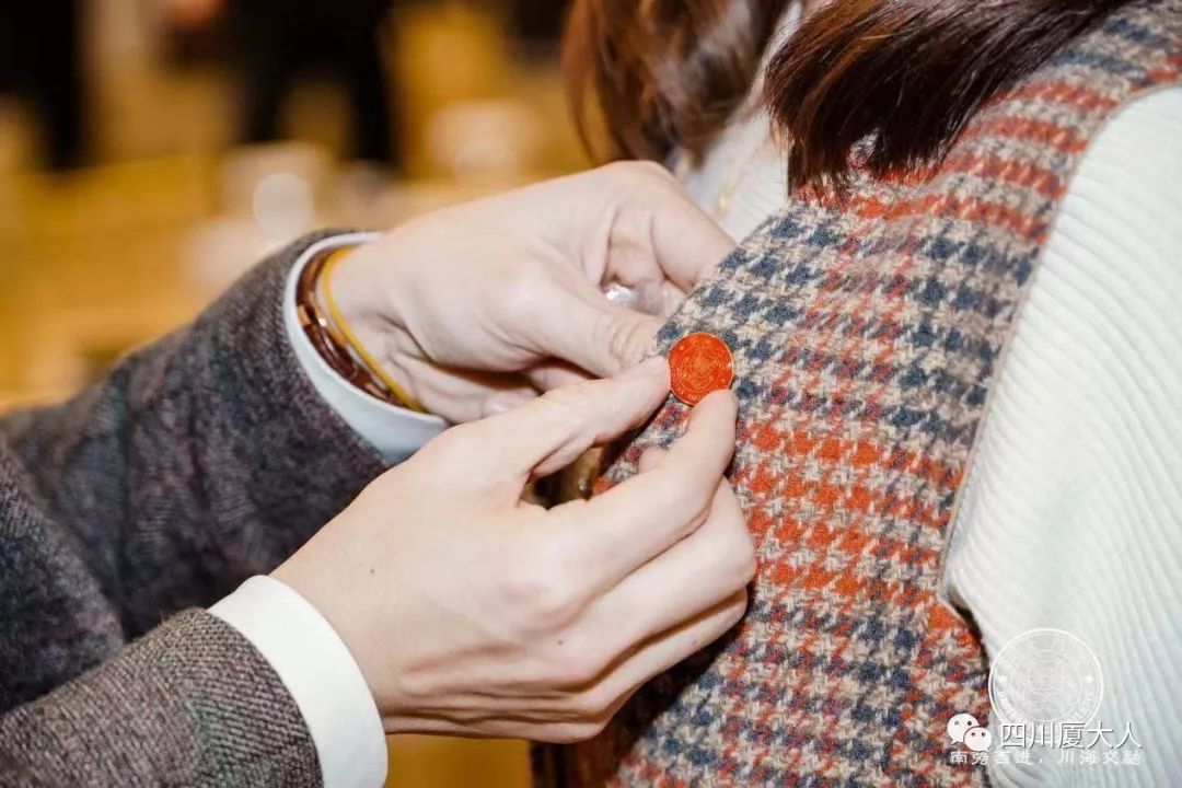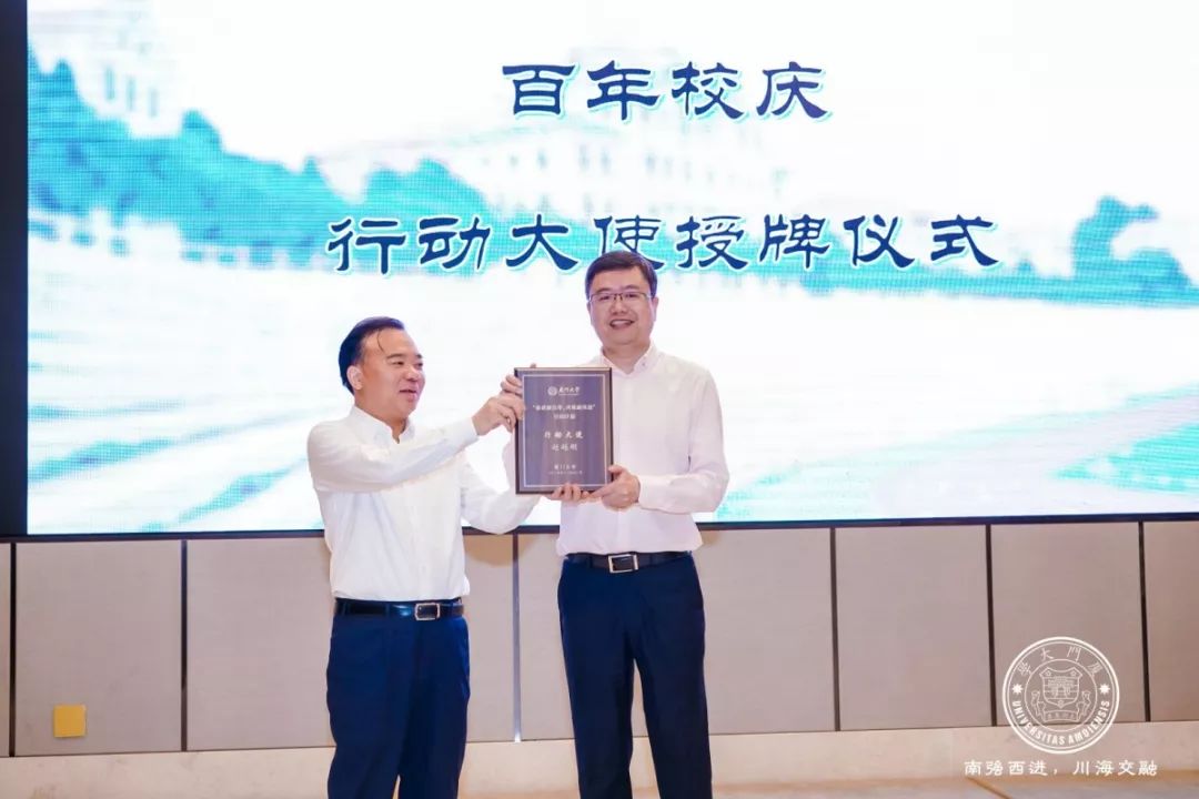 会上,张彦向四川校友会会长赵越刚颁发“‘奋进新百年、共筑新伟业’行动计划行动大使”荣誉奖牌。赵越刚代表四川校友表达了对母校百年校庆的祝福。随后,与会嘉宾共同推开卷轴,“奋进新百年,共筑新伟业”的倡议展现在众人面前,现场响起热烈的掌声。