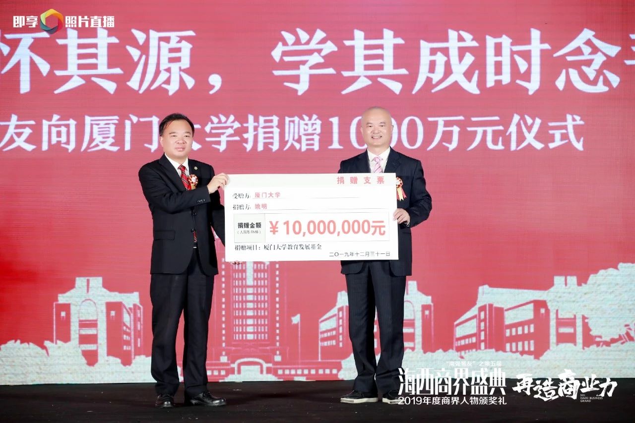 桃李不言、下自成蹊。这一百年来,厦大培养了无数优秀的商界精英,而他们也一直为母校的繁荣发展提供着强大动力和莫大的支持。“尤其是厦门大学杰出校友、厦门校友会会长、姚明集团董事长姚明。他怀着‘成为受人尊敬的企业,让员工过上有尊严的幸福生活’的愿景,用十年时间将姚明织带打造成为全球织带行业第一品牌。2014年,更是走出国门到印度设厂,是践行国家‘一带一路’倡议的引领者。他心系母校发展,已累计捐助近900万元,用实际行动传承着嘉庚精神。”张彦现场肯定了姚明织带的成就以及姚明为母校做出的贡献。
