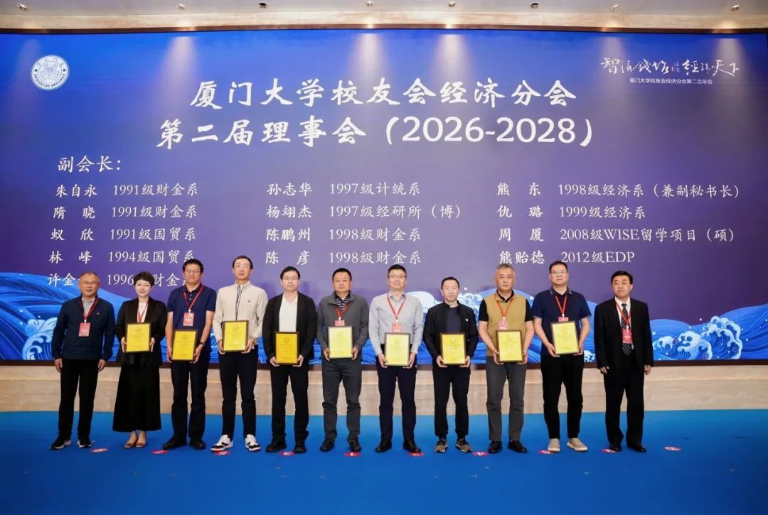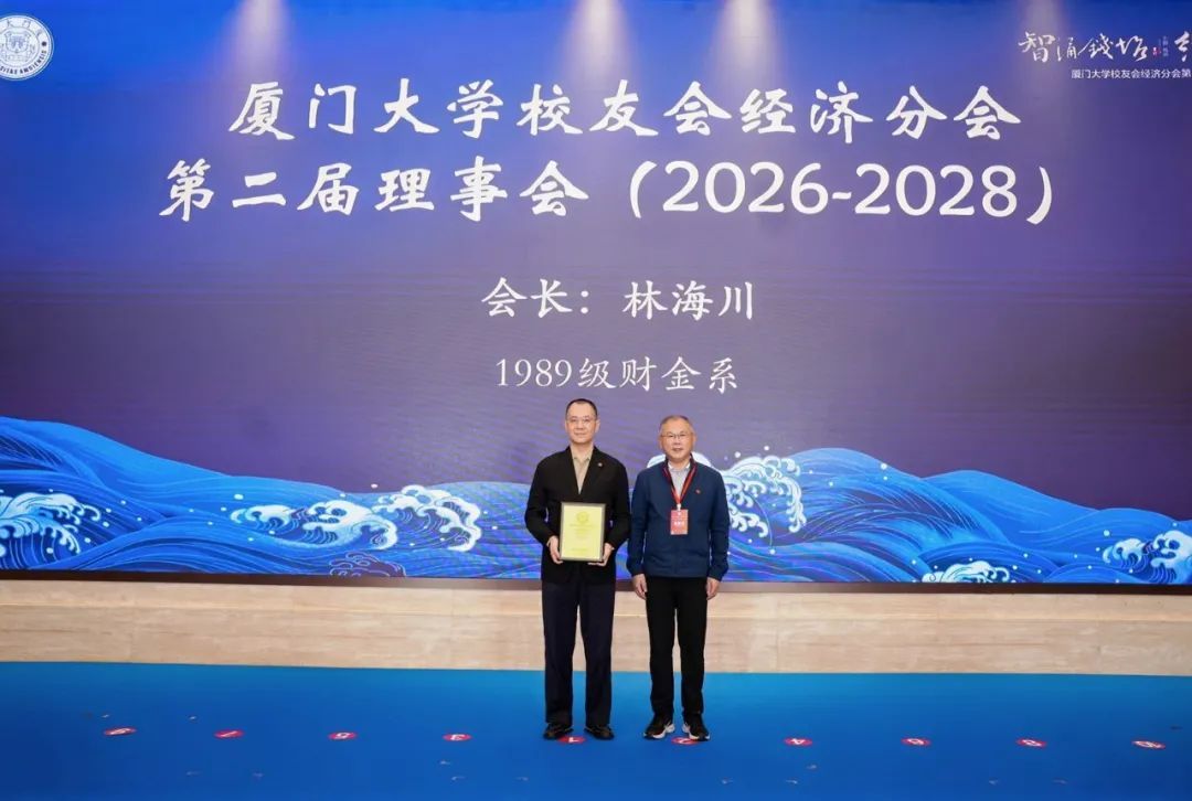 厦门大学经济学院党委书记高忠华为林海川颁发第二届会长聘书。林海川作就职演讲。