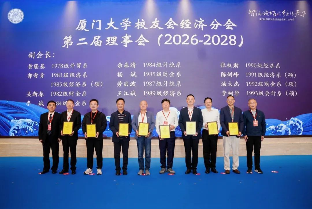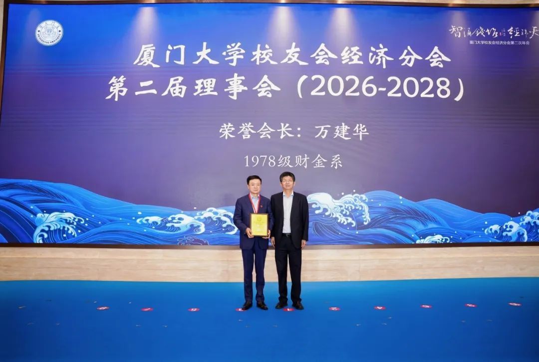 随后,年会举行厦门大学校友会经济分会第二届理事会聘书颁发仪式。徐进功为万建华颁发荣誉会长聘书。