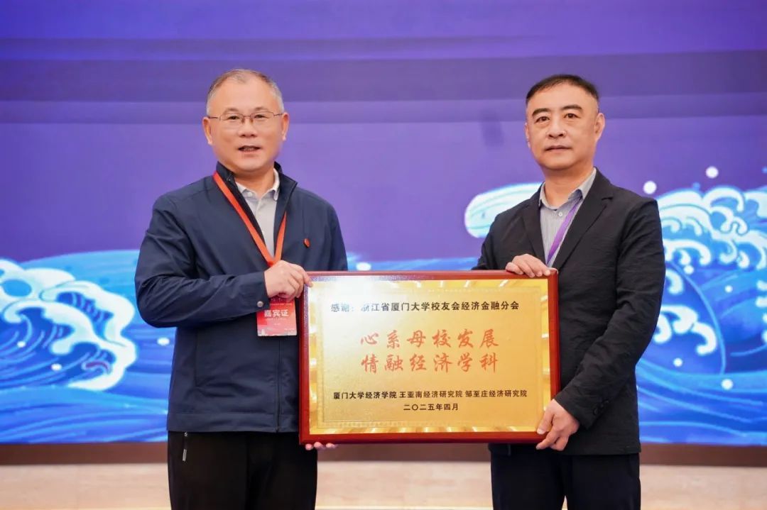 本次年会协办方浙江省厦门大学校友会经济金融分会在整个筹备与举办过程中倾力付出,为感恩其“心系母校发展、情融经济学科”,年会特别设置致谢环节,由高忠华为分会副会长许迅颁发感谢牌。