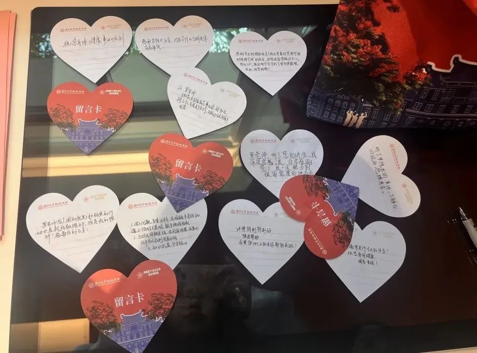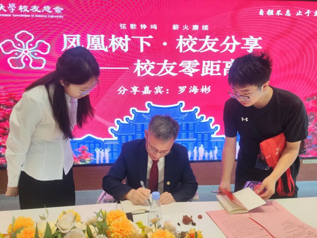 活动尾声,工作人员收集学生填写的校友总会定制凤凰花留言卡,并向参会同学赠送了书籍《天南地北厦大人》及定制笔记本,罗海彬现场为同学们签名留念。本期“凤凰树下·校友分享”在热烈的氛围中圆满结束,期待今日的交流化为未来动力,让嘉庚精神薪火相传,生生不息。