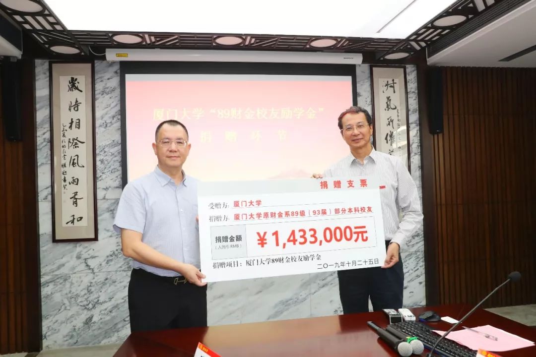 不仅如此,25日下午,在经济学院还举行了一场“89财金校友励学金”赠仪式暨座谈交流会。东莞校友会会长、广东宏川智慧物流股份有限公司董事长兼总裁林海川代表89级财金系校友向学校进行捐赠。该励学金是由89级财金系66位本科校友捐资设立,定向资助厦门大学经济学院财政系和金融系家庭经济困难且在校期间已办理校园地国家助学贷款的学生。截止目前,捐赠金额已达到143.3万元。